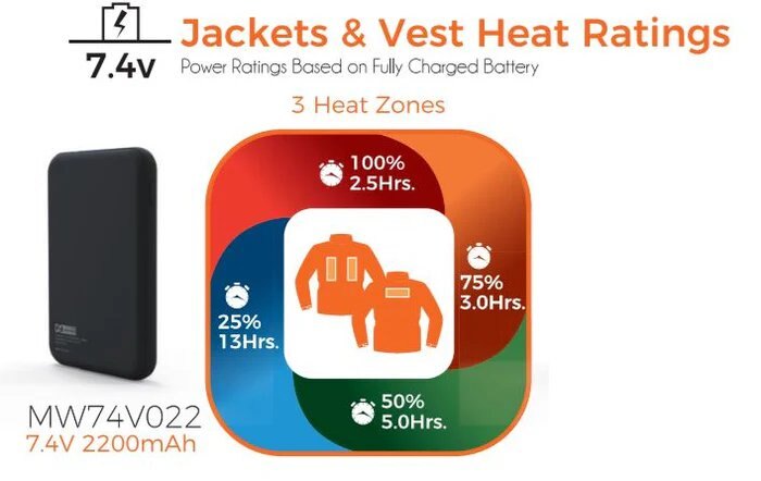 Mobile Warming garments have multiple power settings to tailor to your unique heating needs and to get the most out of your heated gear! On these vests you typically have 3 heat zones that can be run at 4 different heat settings.