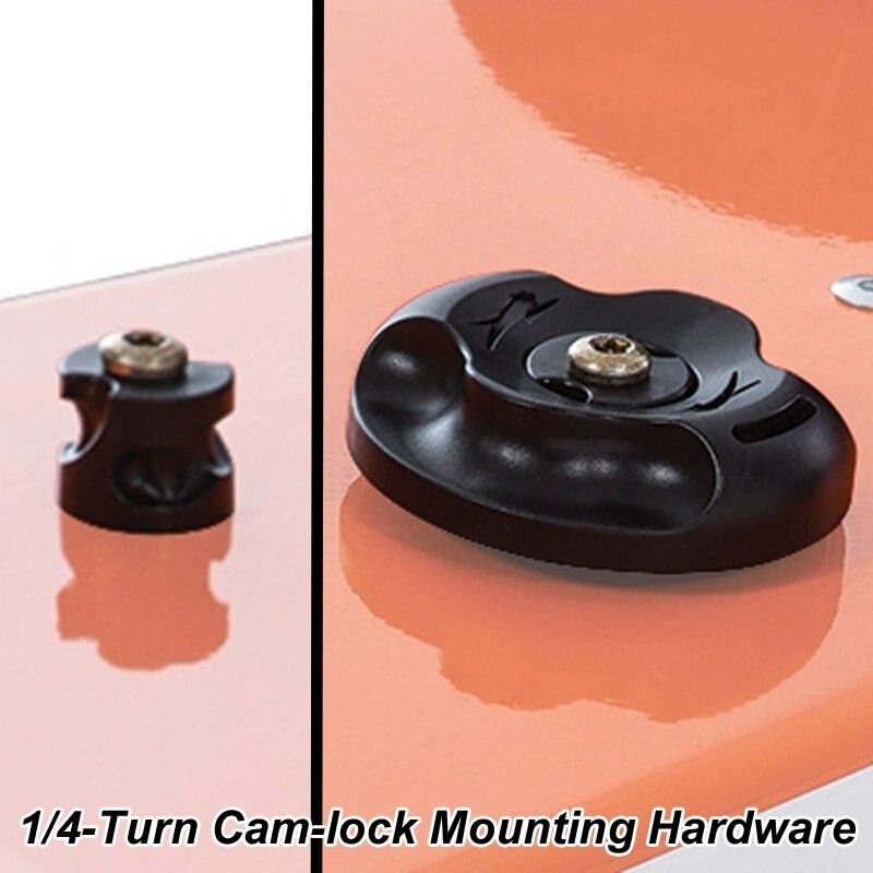 Cam-lock attachment with quarter-turn system eliminates straps and hooks